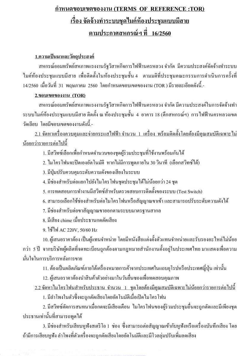 ประกาศที่ 16/2560 เรื่อง เชิญชวนประกวดราคาจัดจ้างทำระบบชุดไมค์ห้องประชุมแบบมีสาย