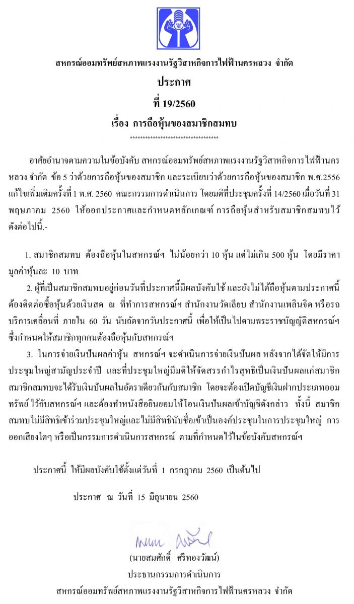 • ประกาศที่ 19/2560 เรื่อง การถือหุ้นของสมาชิกสมทบ