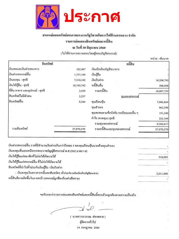 ประกาศ เรื่อง รายการย่อแสดงสินทรัพย์และหนี้สิน ณ วันที่ 30 มิ.ย. 60