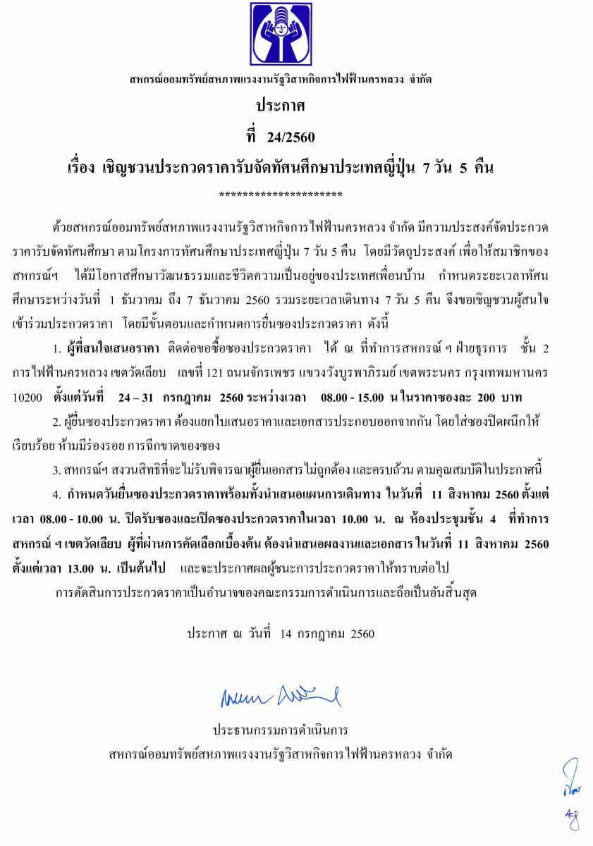 ประกาศที่ 24/2560 เรื่อง เชิญชวนประกวดราคารับจัดทัศนศึกษาประเทศญี่ปุ่น 7 วัน 5 คืน