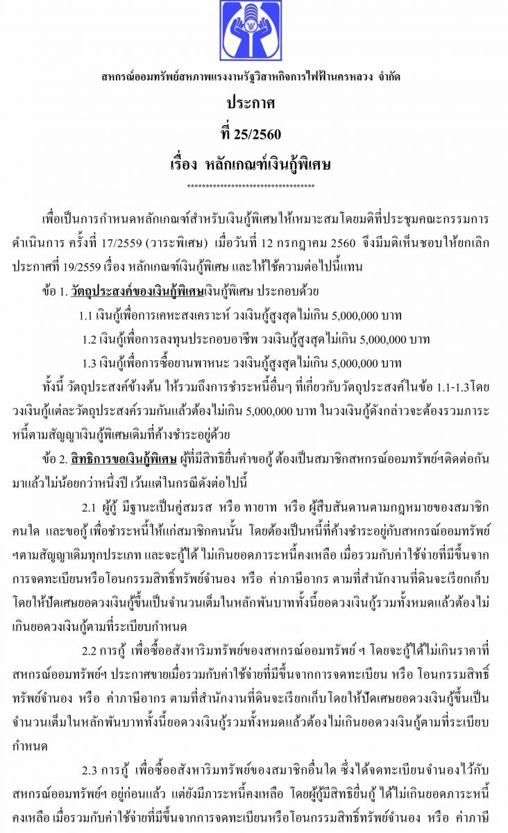 • ประกาศที่ 25/2560 เรื่อง หลักเกณฑ์เงินกู้พิเศษ