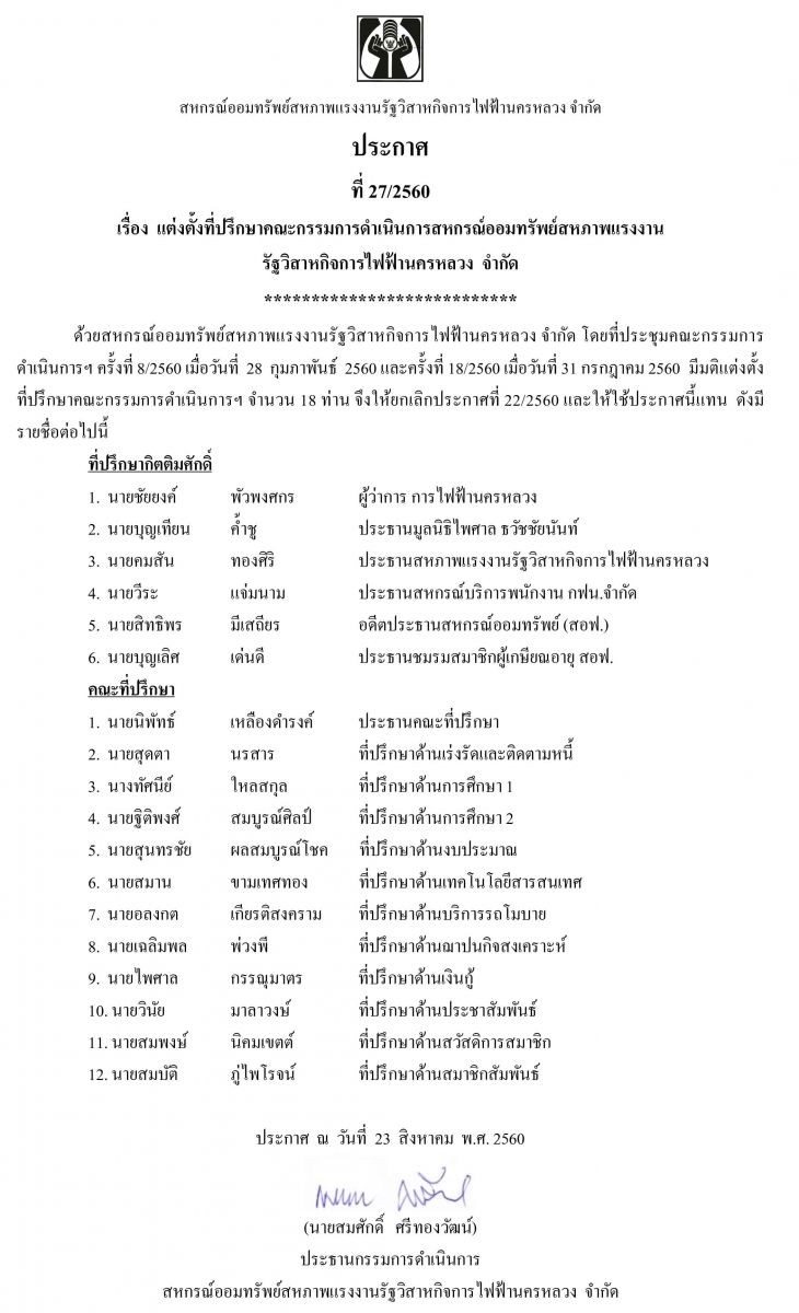• ประกาศที่ 27/2560 เรื่อง แต่งตั้งที่ปรึกษาคณะกรรมการดำเนินการสหกรณ์ออมทรัพย์ฯ