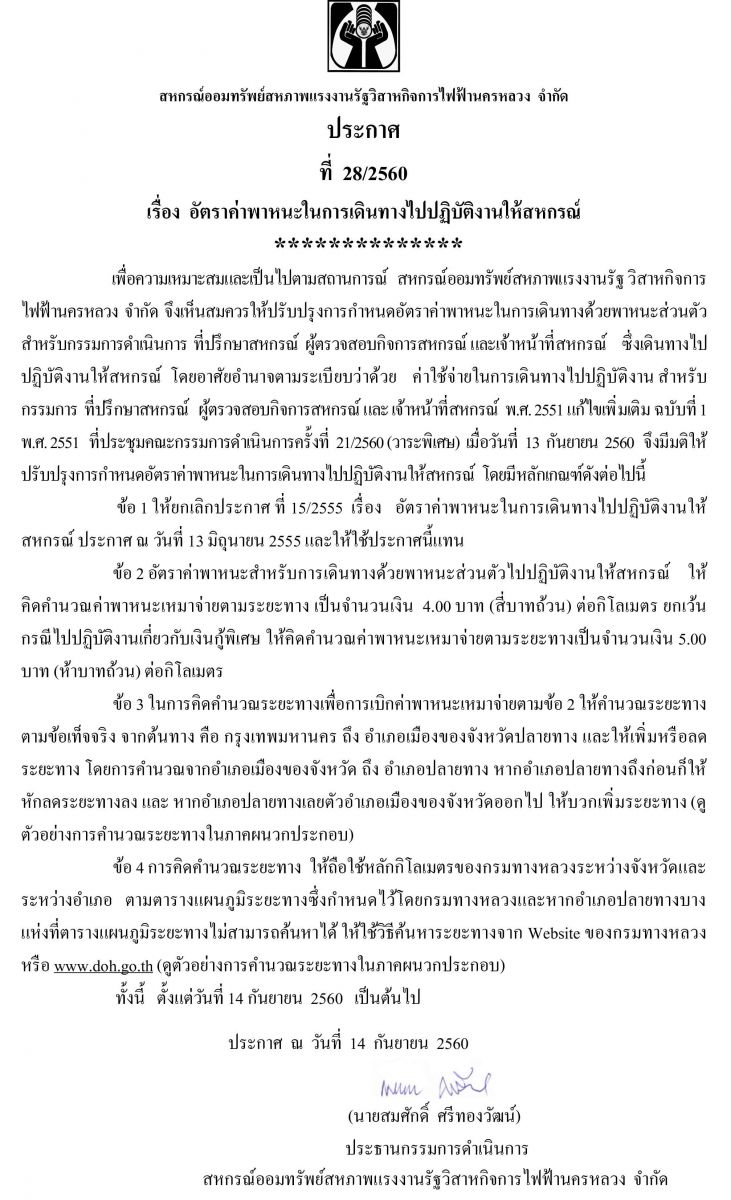 ประกาศที่ 28/2560 เรื่อง อัตราค่าพาหนะในการเดินทางไปปฏิบัติงานให้สหกรณ์