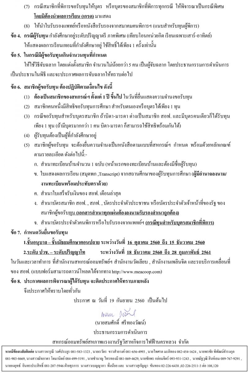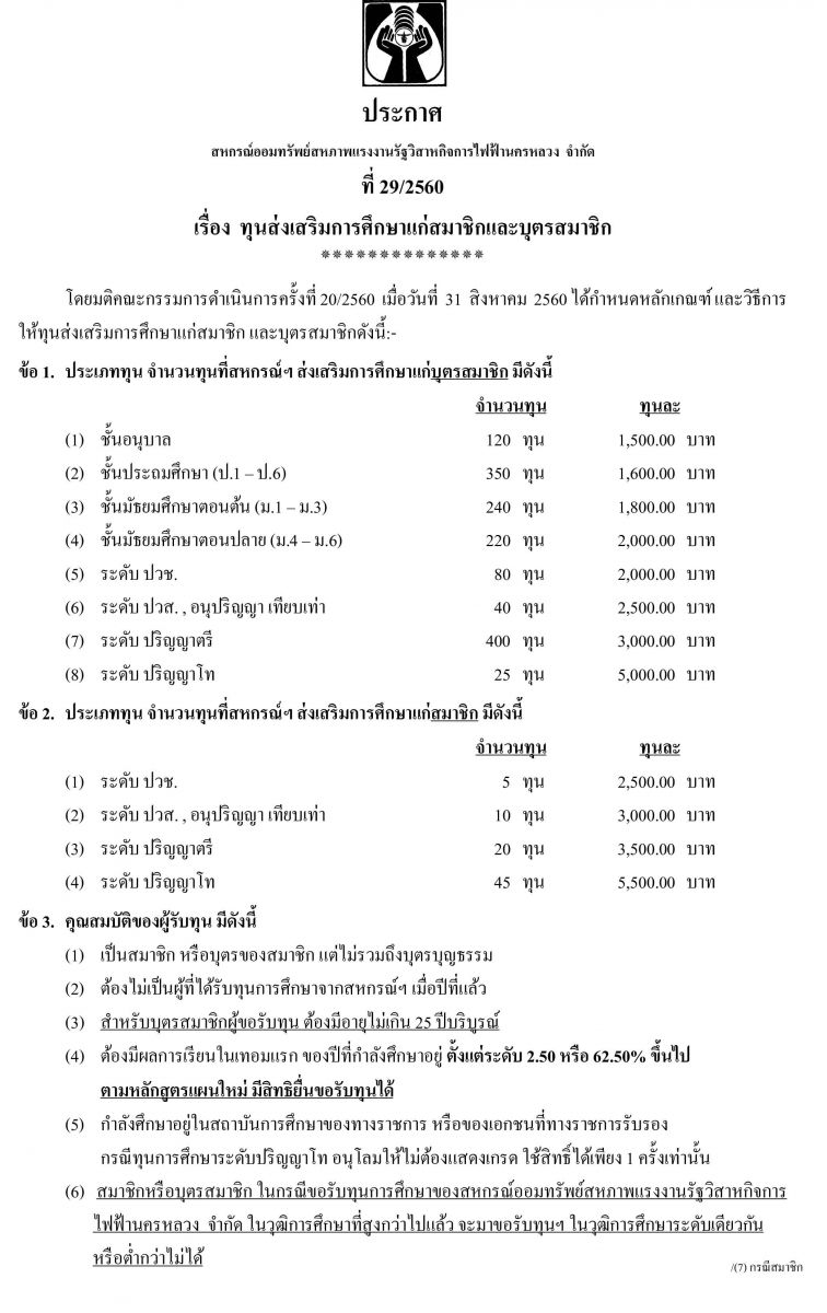 • ประกาศที่ 29/2560 เรื่อง ทุนส่งเสริมการศึกษาแก่สมาชิกและบุตรสมาชิก