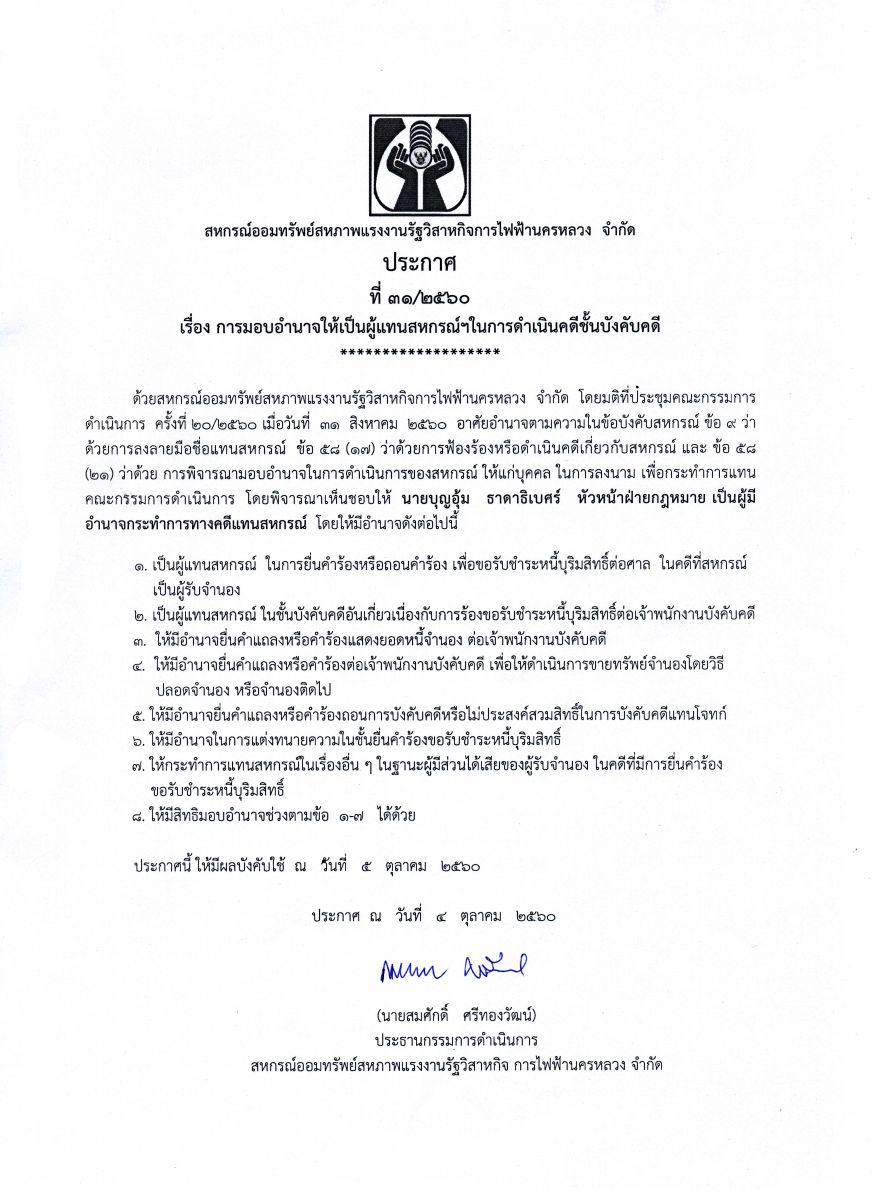 • ประกาศที่ 31/2560 เรื่อง การมอบอำนาจให้เป็นผู้แทนสหกรณ์ฯในการดำเนินคดีชั้นบังคับคดี