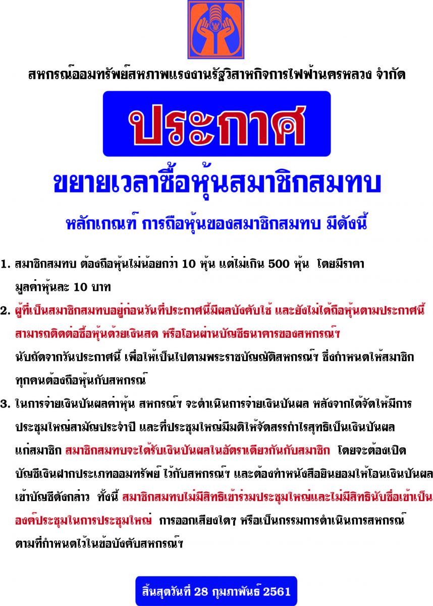 ประกาศขยายเวลาซื้อหุ้นสมาชิกสมทบ