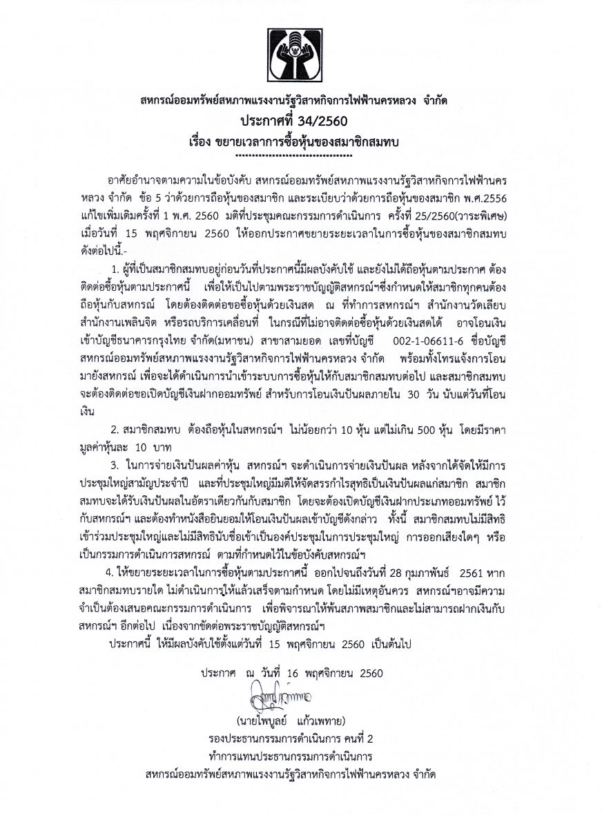 • ประกาศที่ 34/2560 เรื่อง ขยายเวลาซื้อหุ้นของสมาชิกสมทบ