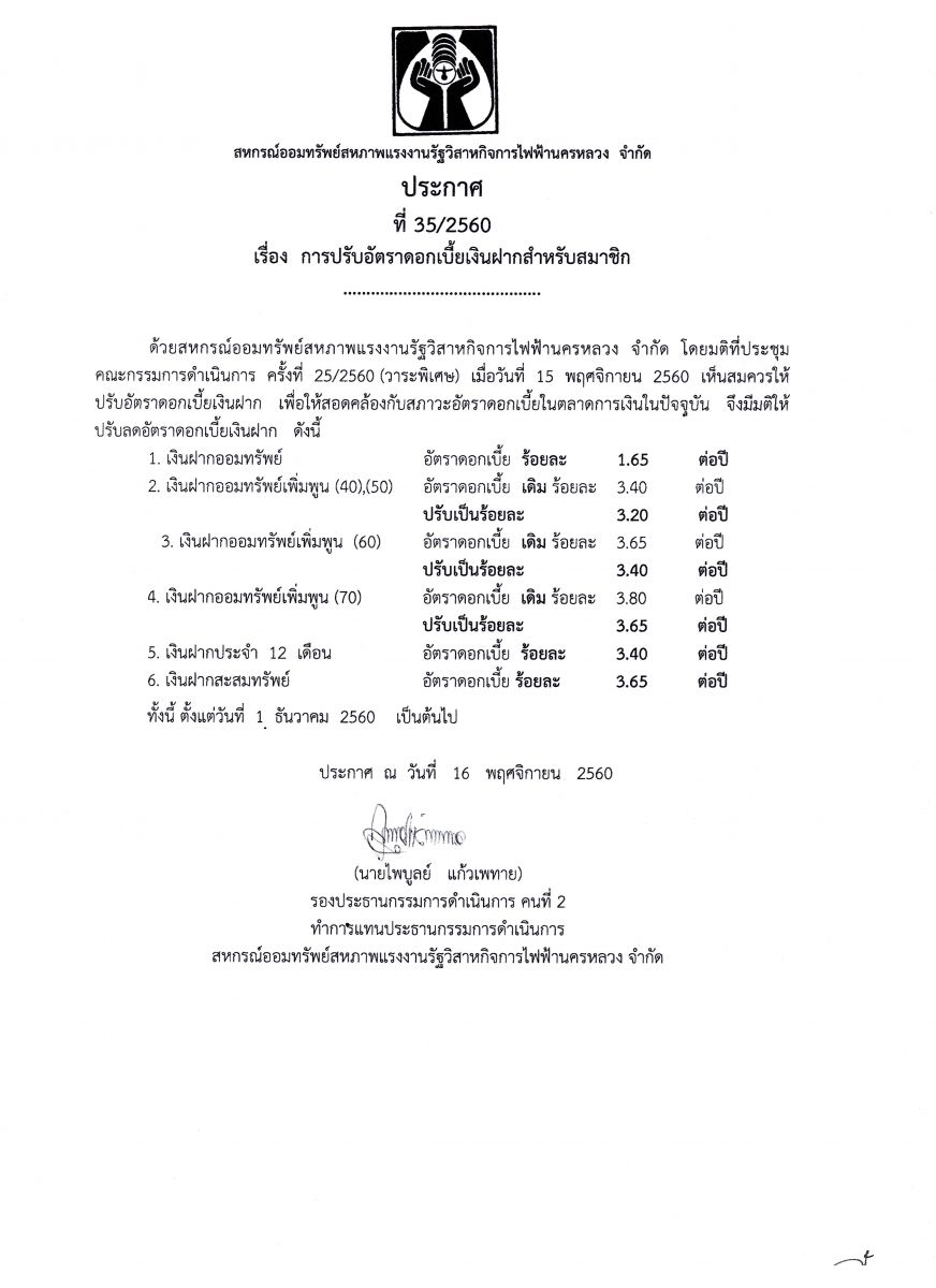 • ประกาศที่ 35/2560 เรื่อง การปรับอัตราดอกเบี้ยเงินฝากสำหรับสมาชิก