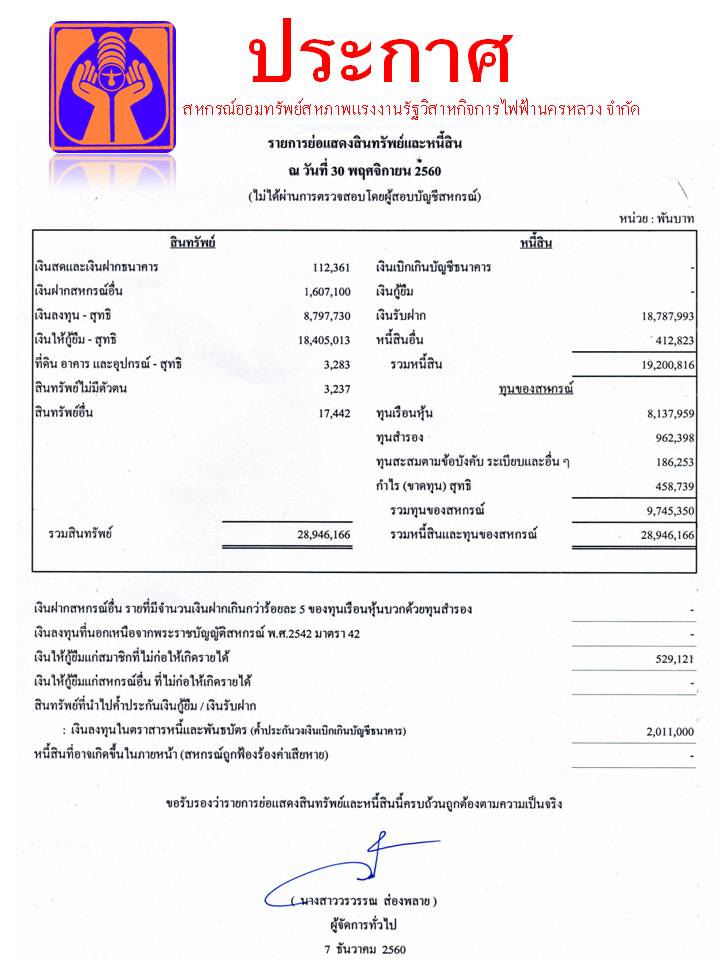 ประกาศ เรื่อง รายการย่อแสดงสินทรัพย์และหนี้สิน ณ วันที่ 7 ธันวาคม 2560