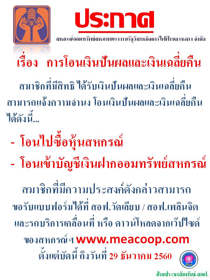 • ประกาศ เรื่อง การโอนเงินปันผลและเงินเฉลี่ยคืน