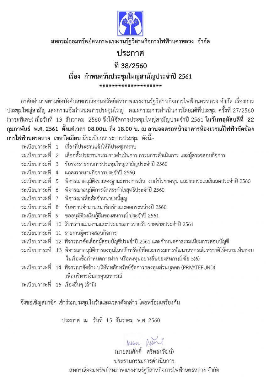 • ประกาศที่ 38/2560 เรื่อง กำหนดวันประชุมใหญ่สามัญประจำปี 2561