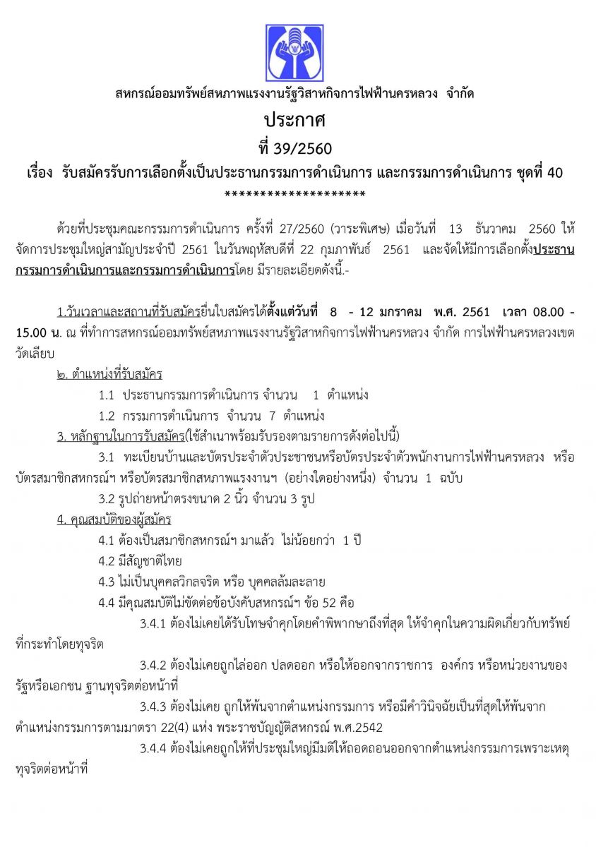 ประกาศที่ 39/2560 เรื่อง รับสมัครรับการเลือกตั้งเป็นประธานฯ และกรรมการดำเนินการ ชุดที่ 40