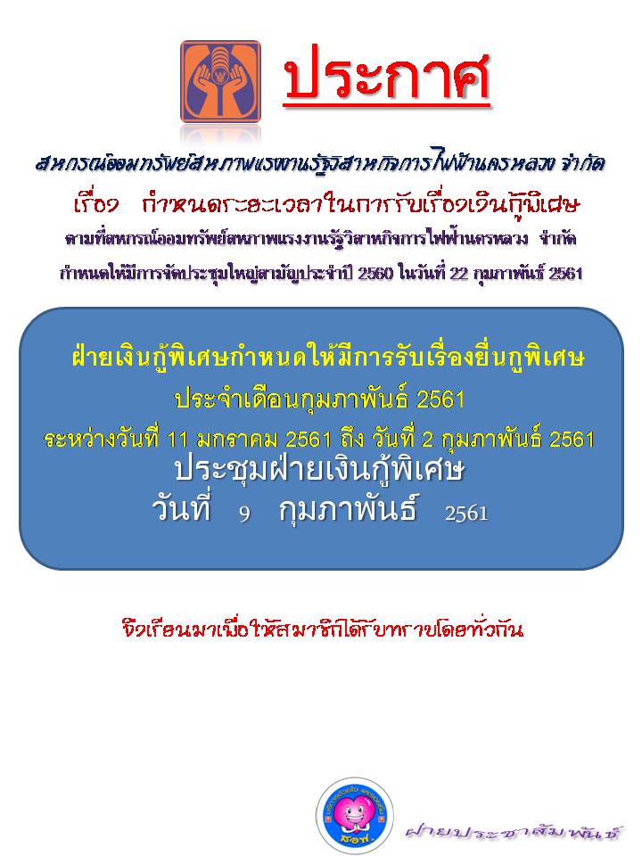 • ประกาศ เรื่อง กำหนดระยะเวลาในการรับเรื่องเงินกู้พิเศษ