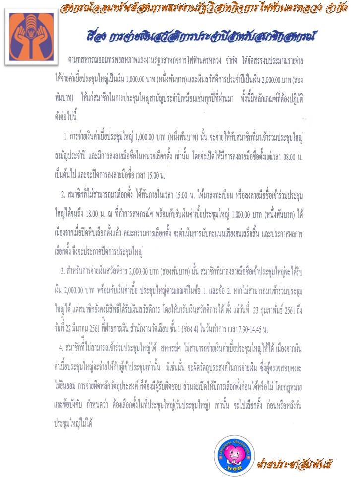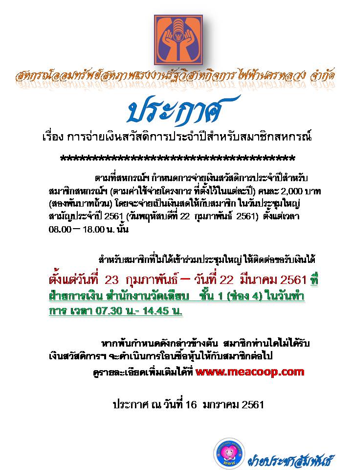 ประกาศ เรื่อง การจ่ายเงินสวัสดิการประจำปีสำหรับสมาชิกสหกรณ์