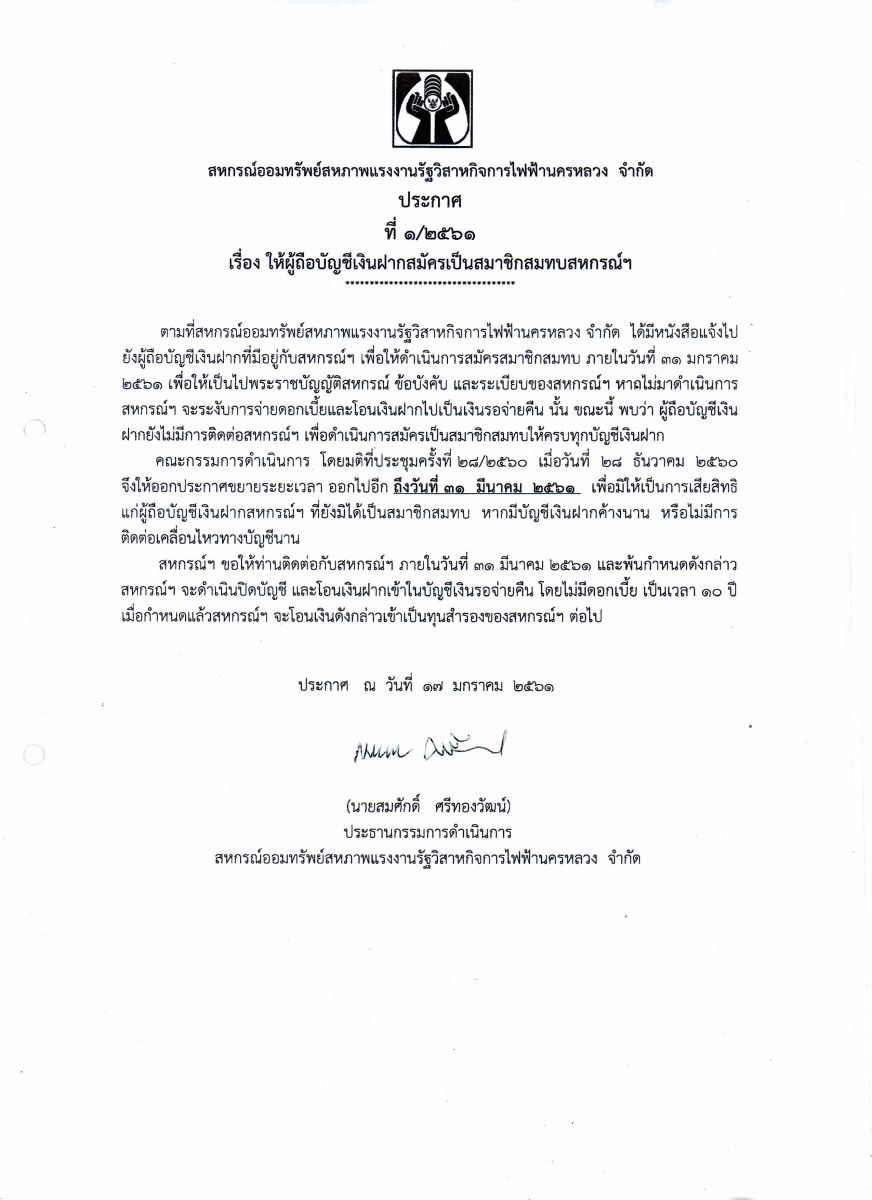 • ประกาศที่ 1/2561 เรื่อง ให้ผู้ถือบัญชีเงินฝากสมัครเป็นสมาชิกสมทบ