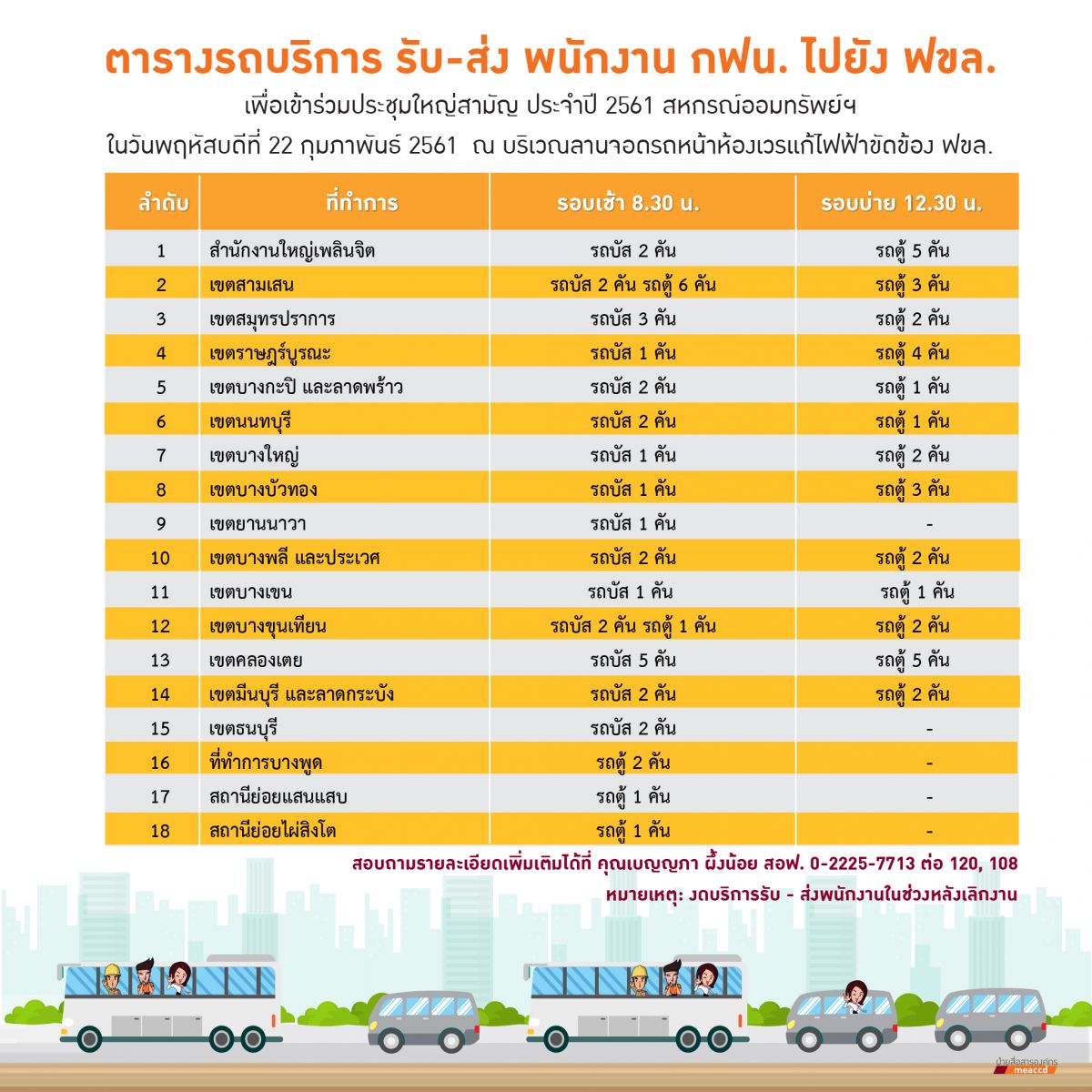 ตารางรถบริการ รับ-ส่ง พนักงาน กฟน. เพื่อร่วมประชุมใหญ่ 22 ก.พ. 2561