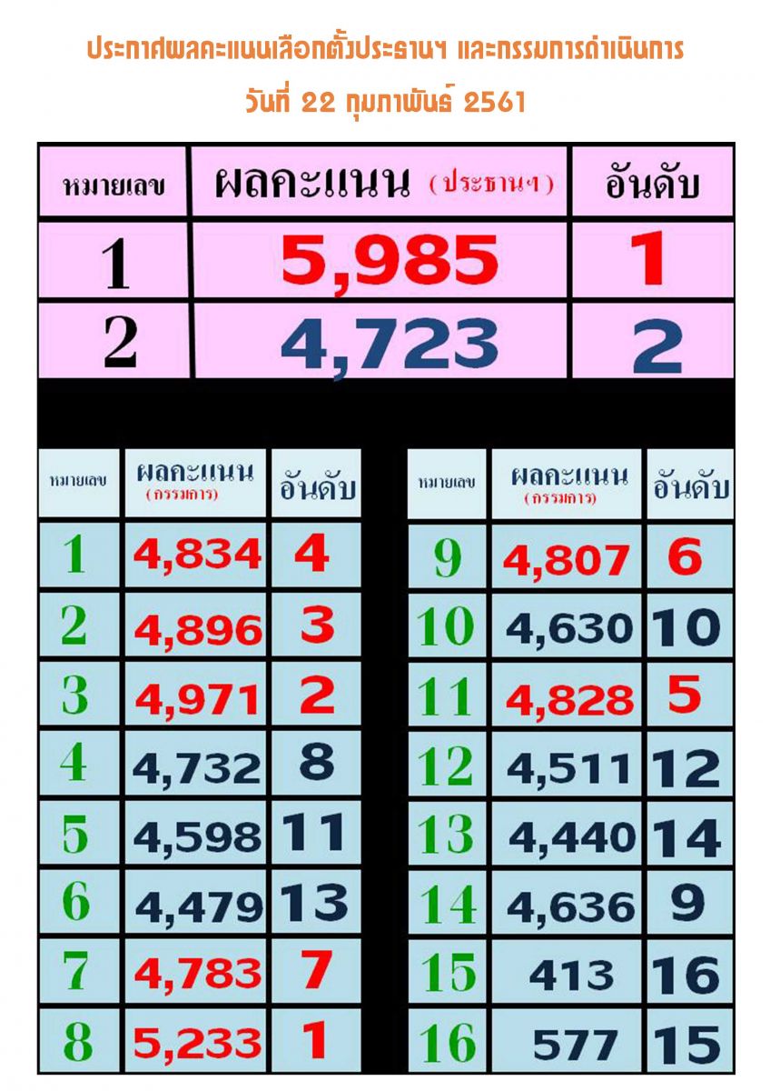 ประกาศผลคะแนนเลือกตั้งประธานฯ และกรรมการดำเนินการ ประจำปี 2561