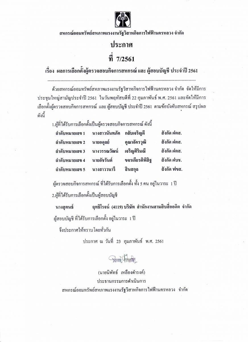 • ประกาศที่ 7/2561 เรื่อง ผลการเลือกตั้งผู้ตรวจสอบกิจการสหกรณ์ และผู้สอบบัญชี ประจำปี 2561