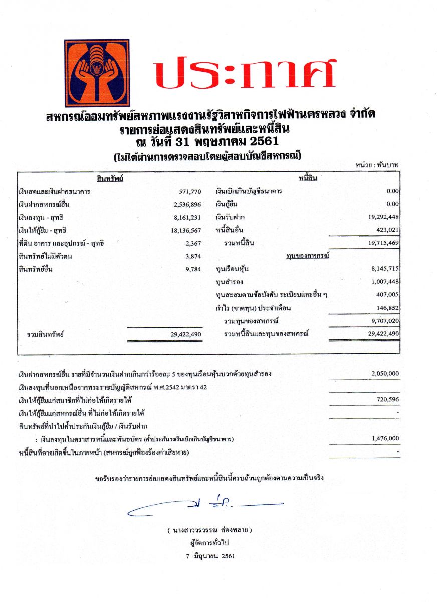 ประกาศ เรื่อง รายการย่อแสดงสินทรัพย์และหนี้สิน ณ วันที่ 31 พฤษภาคม 2561