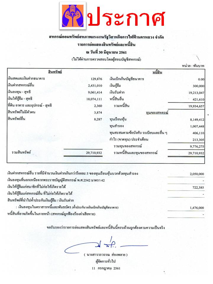 ประกาศ เรื่อง รายการย่อแสดงสินทรัพย์และหนี้สิน ณ วันที่ 30 มิถุนายน 2561