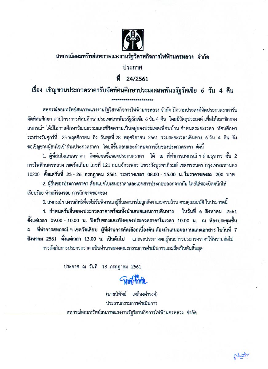 • ประกาศที่ 24/2561 เรื่อง เชิญชวนประกวดราคารับจัดทัศนศึกษาประเทศสหพันธรัฐเซีย 6 วัน 4 คืน