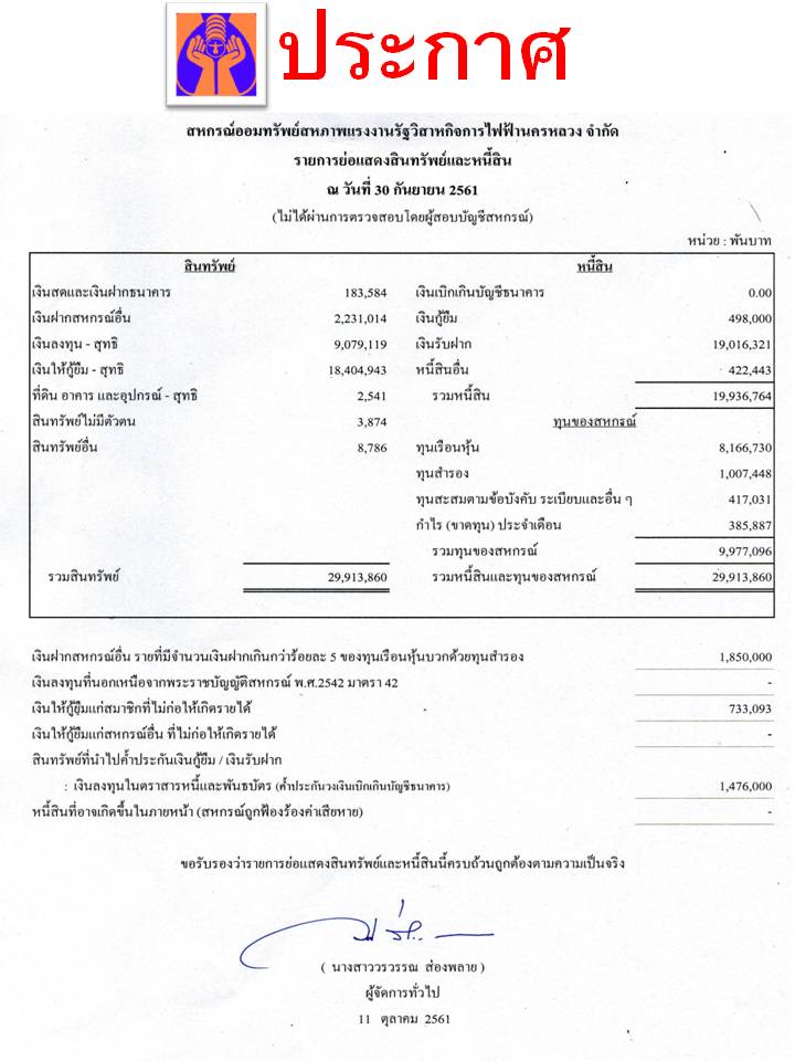 ประกาศ รายการย่อแสดงสินทรัพย์และหนี้สิน ณ วันที่ 30 กันยายน 2561
