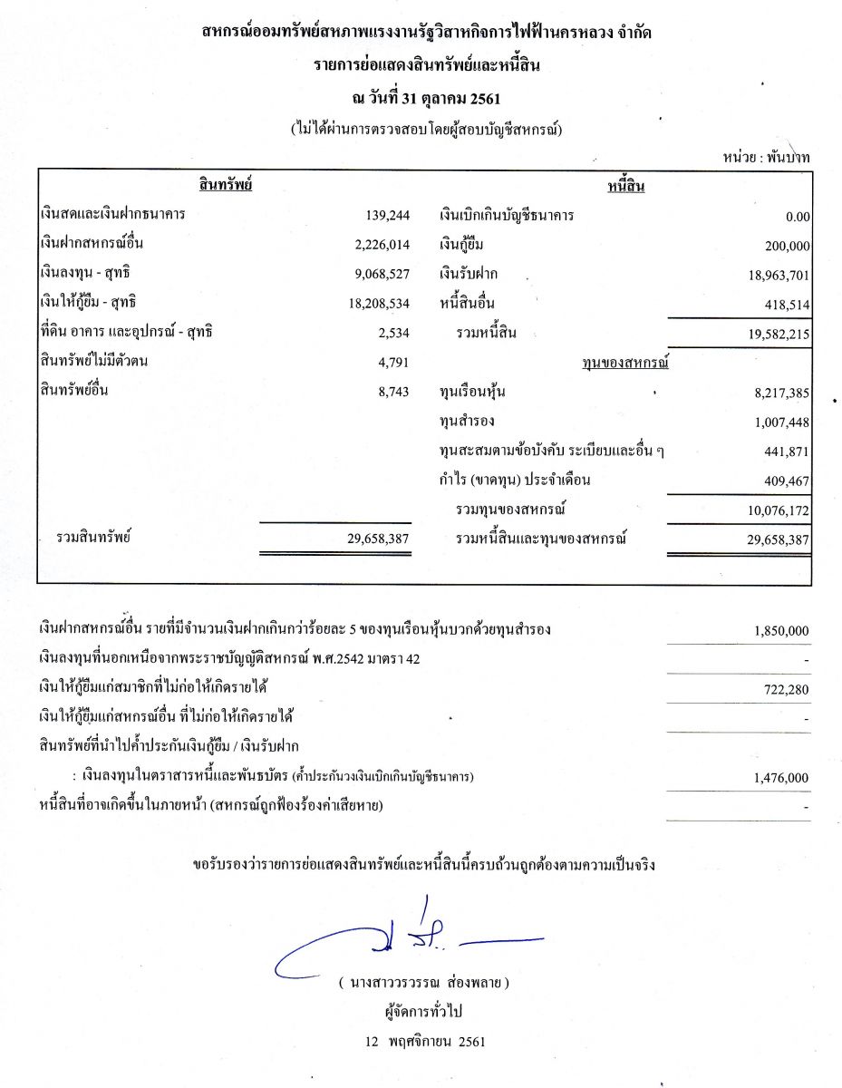 ประกาศ รายการย่อแสดงสินทรัพย์และหนี้สิน ณ วันที่ 31 ตุลาคม 2561