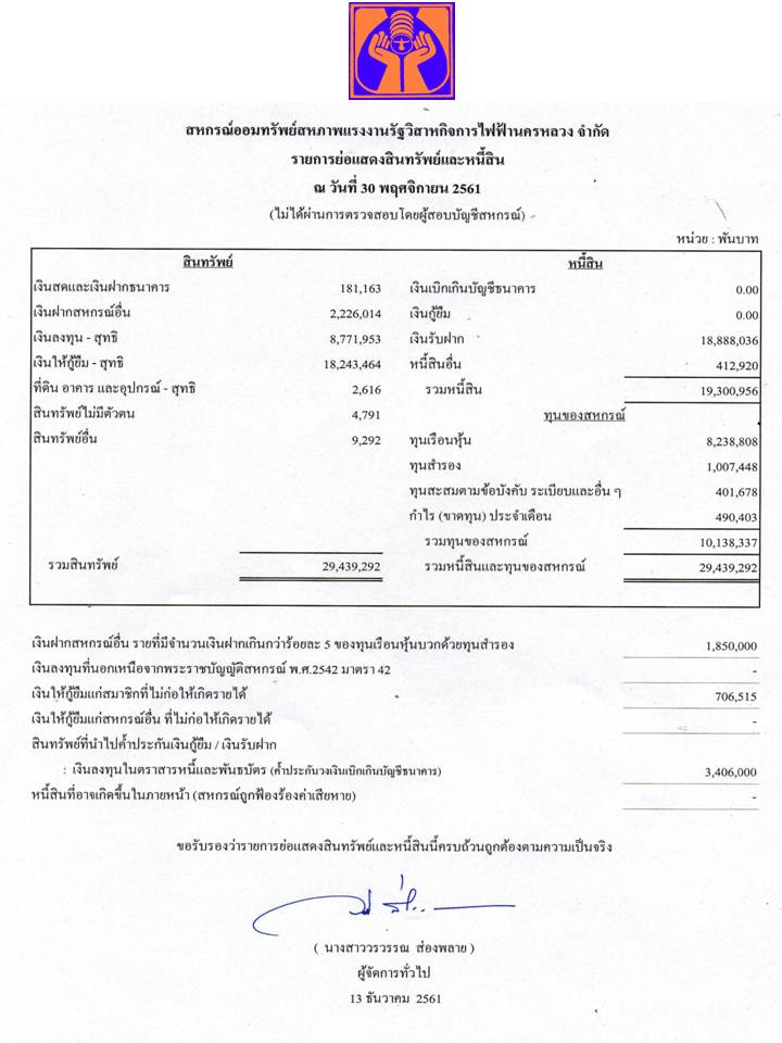 ประกาศ รายการย่อแสดงสินทรัพย์และหนี้สิน ณ วันที่ 30 พฤศจิกายน 2561