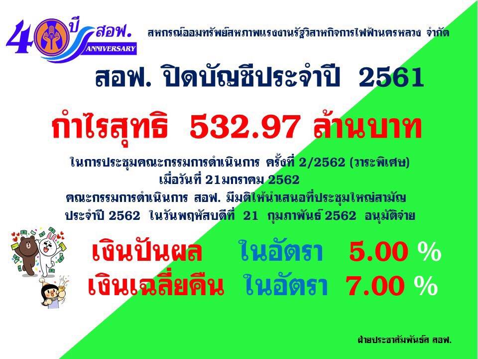 • ประกาศ เรื่อง กำไรสุทธิ และอัตราการจ่ายเงินปันผล และเงินเฉลี่ยคืน ประจำปี 2561
