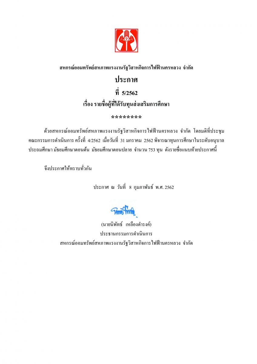 • ประกาศที่ 5/2562 เรื่อง รายชื่อผู้ที่ได้รับทุนส่งเสริมการศึกษา
