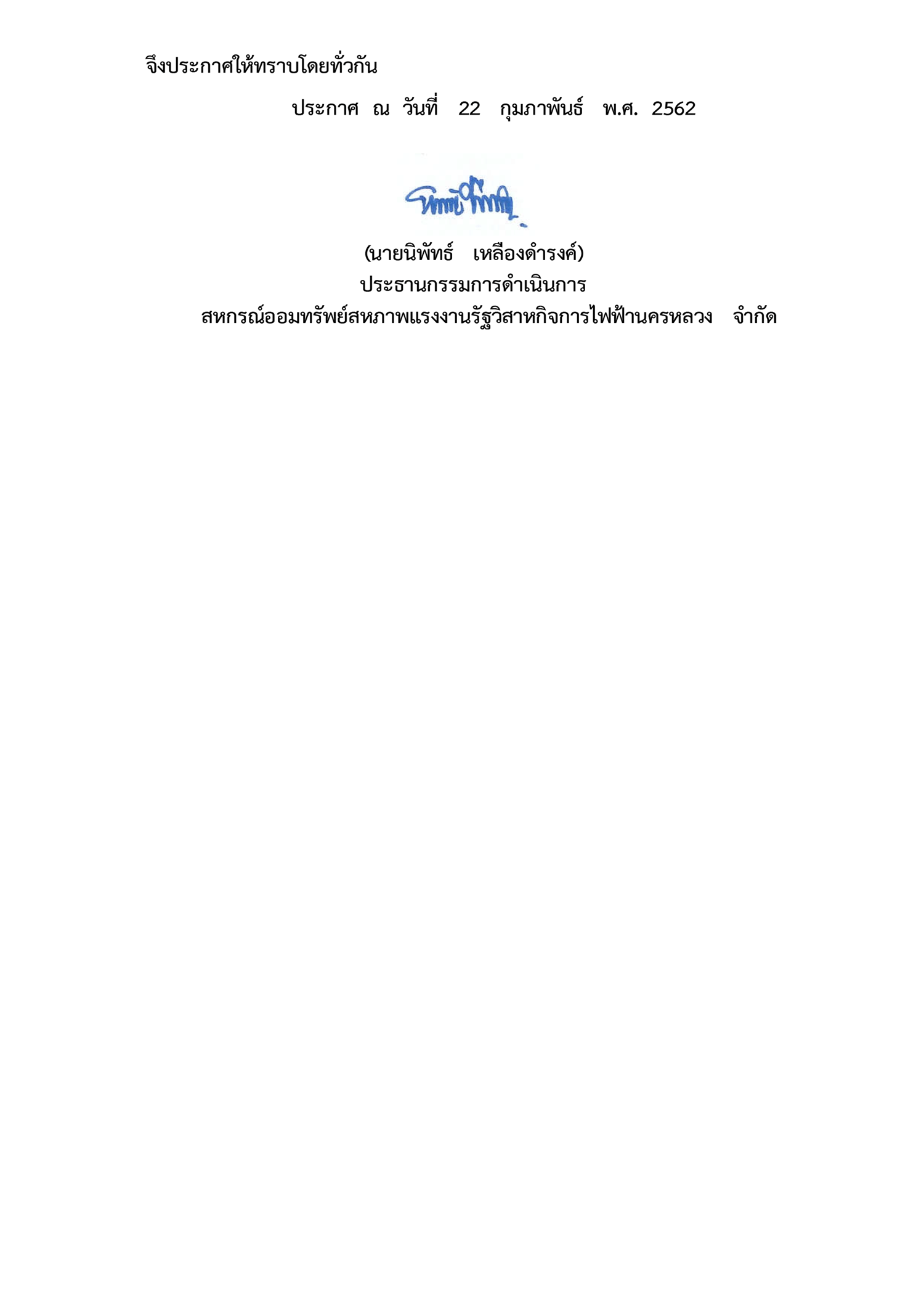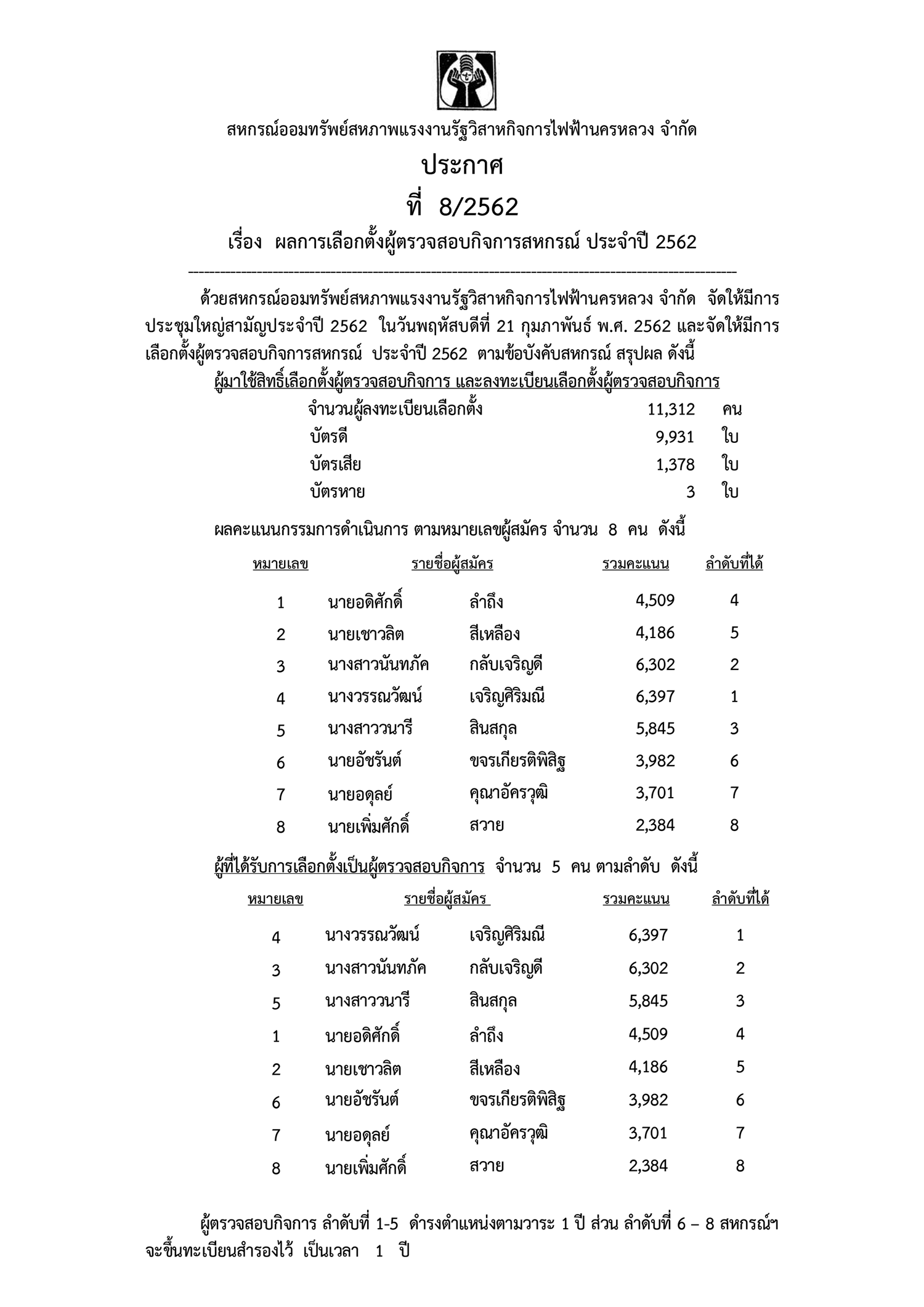 • ประกาศที่ 8/2562 เรื่อง ผลการเลือกตั้งผู้ตรวจสอบกิจการสหกรณ์ ประจำปี 2562