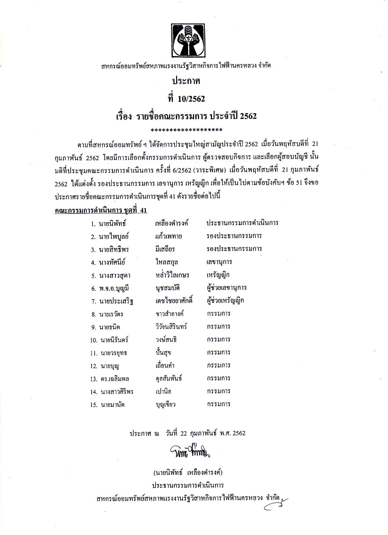 • ประกาศที่ 10/2562 เรื่อง รายชื่อคณะกรรมการ ประจำปี 2562