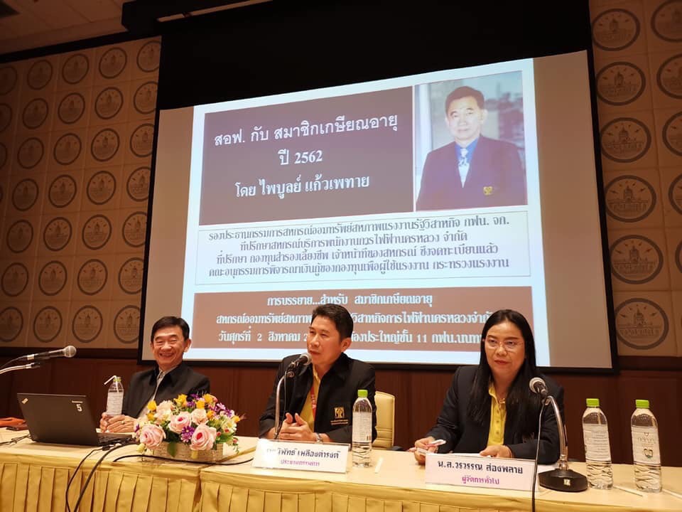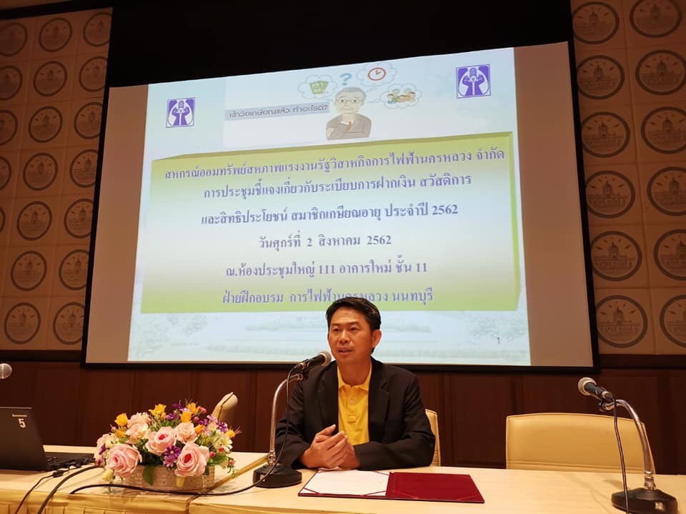 ท่าน รองผู้ว่าฯ การเงิน นายธานี ปาริชาติอินทราณี เปิดการประชุมชี้แจงสมาชิกเกษียณอายุ ปี 2562 สมาชิกผู้มีคุณูปการต่อสหกรณ์ มาจนถึงวันเกษียณอายุงาน และจะคงการเป็นสมาชิกต่อไป ทั้งนี้สมาชิกให้ความสนใจเข้าร่วมรับฟังการชี้แจงสิทธิประโยชน์ที่พึงได้จากสหกรณ์ออมทรัพย์ ณ ห้องประชุมฝ่ายฝึกอบรม การไฟฟ้านครหลวง เขตนนทบุรี
