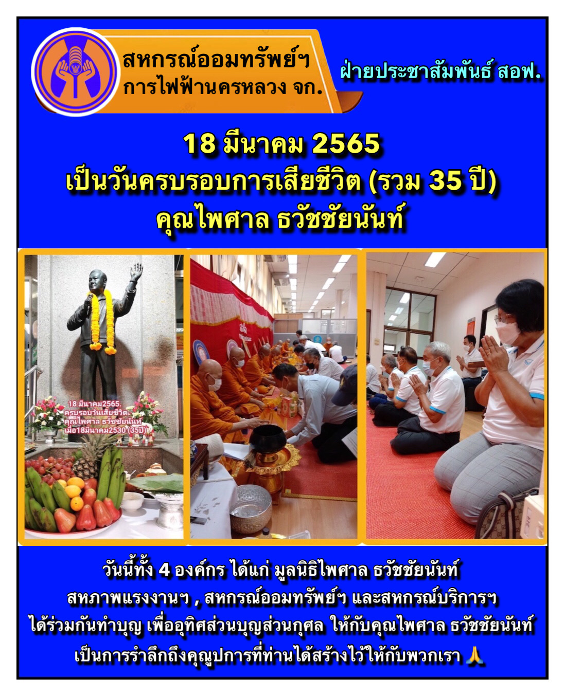 วันนี้ (18 มี.ค. 65) ทั้ง 4 องค์กร ได้แก่ มูลนิธิไพศาล ธวัชชัยนันท์ สหภาพแรงงานฯ , สหกรณ์ออมทรัพย์ฯ และสหกรณ์บริการฯ ได้ร่วมกันทำบุญ เพื่ออุทิศส่วนบุญส่วนกุศล ให้กับคุณไพศาล ธวัชชัยนันท์ เป็นการรำลึกถ