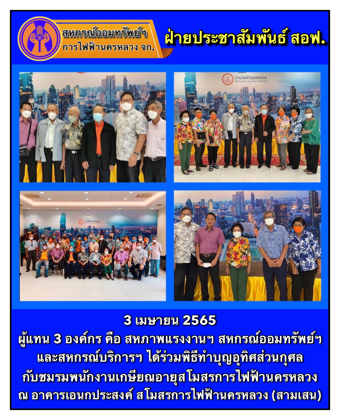 ผู้แทน 3 องค์กร คือ สหภาพแรงงานฯ สหกรณ์ออมทรัพย์ฯ และสหกรณ์บริการฯ ได้ร่วมพิธีทำบุญอุทิศส่วนกุศล กับชมรมพนักงานเกษียณอายุสโมสรการไฟฟ้านครหลวง ณ อาคารเอนกประสงค์ สโมสรการไฟฟ้านครหลวง (สามเสน)